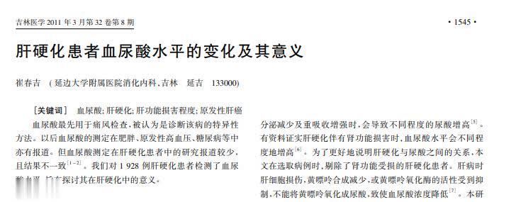 参考资料:[1] 崔春吉.肝硬化患者血尿酸水平的变化及其意义, 吉林医学, 2011-03-15