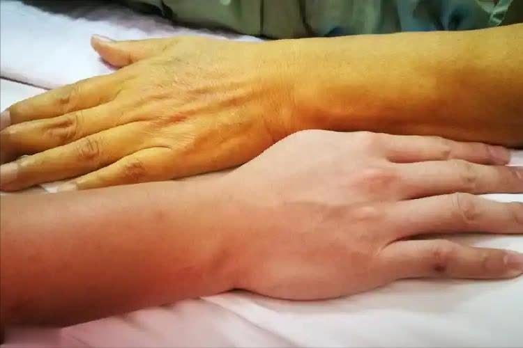 有一位中年女性,最近几周,她的家人注意到她的眼白变黄,皮肤也出现了轻微的黄色,尤其是在脸部和手背。