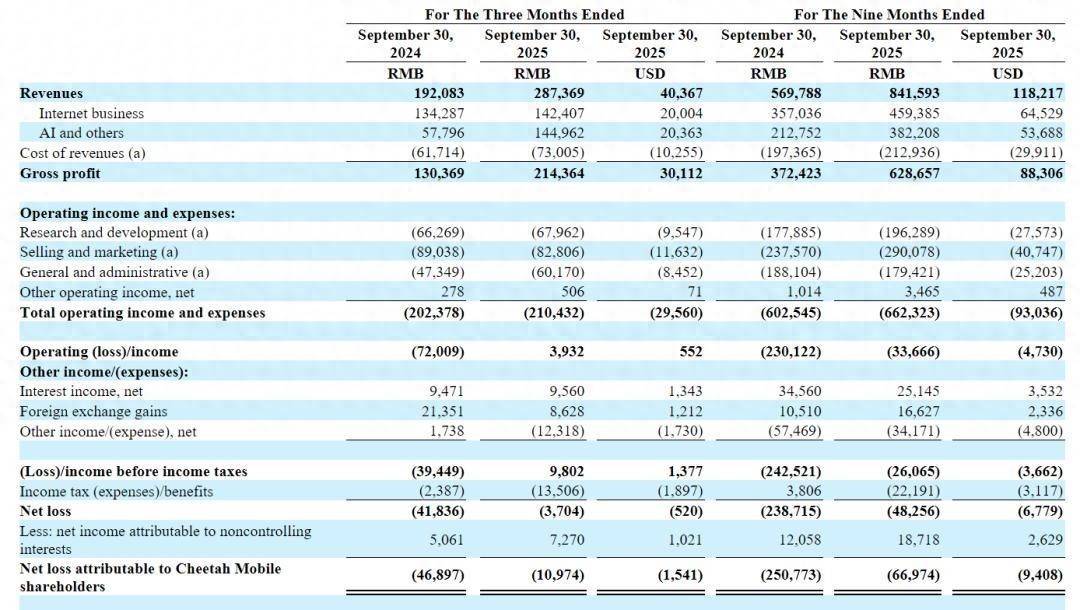 猎豹移动2025年第三季度营收为2.87亿元(约4040万美元),其中,互联网业务(Internet business)收入为1.42亿元,上年同期为1.34亿元;AI及其他业务收入为1.45亿元(约2036万美元),上年同期为5780万元。