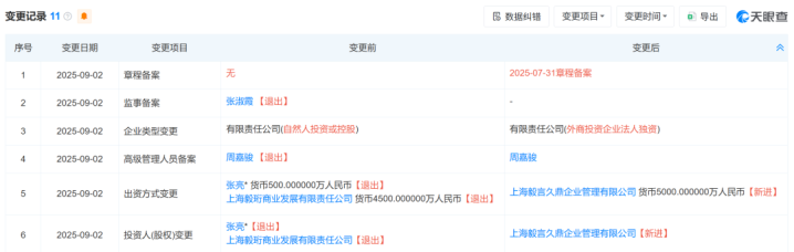 天眼查APP显示,9月初,张亮麻辣烫关联公司——张亮企业管理(集团)有限公司发生工商变更。上海毅言久鼎企业管理有限公司作为新的控股股东,持有张亮企业管理(集团)有限公司100%股权,认缴出资额5000万人民币。原股东上海毅珩商业发展有限责任公司(持股90%)和创始人张亮(持股10%)退出股东行列。